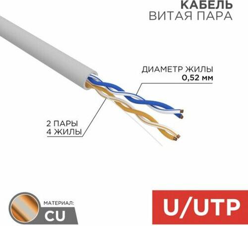 Rexant Кабель витая пара, U/UTP, CAT 5e, ZH нг(А)-HF, 2х2х0,52мм, 24AWG, INDOOR, SOLID, серый, 305м PRO, цена за 1 бухта